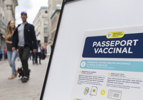 People walk by a sign outside a restaurant advising customers of the Quebec government’s newly implemented COVID-19 vaccine passport in Montreal on Sept. 6, 2021. Quebec’s public health institute said recently there were 414 active outbreaks in the province, 52 of which were in primary schools or preschools and 69 were in daycares.Graham Hughes/The Canadian Press