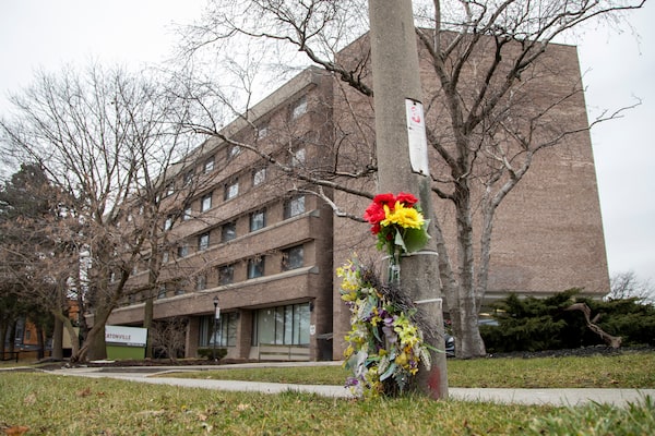Flowers were placed on a lamppost outside Eatonville Care Centre in Toronto on Dec. 30, 2021.CARLOS OSORIO/Reuters