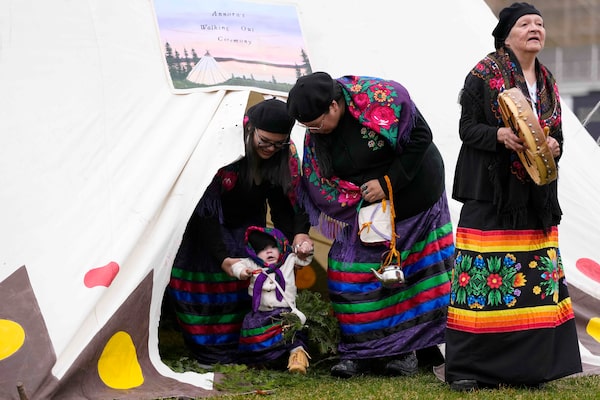 Six-month-old Annora Crowe is helped by her mother Kimisha-Ann Capissisit and grandmother Angela Ottereyes at her Walking Out Ceremony, a traditional ceremony welcoming a Cree baby's first steps on the earth, on Parliament Hill on Wednesday.Justin Tang/The Canadian Press