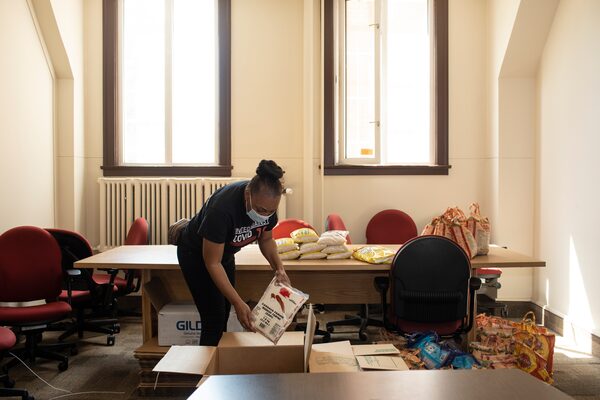 Volunteer Courtney Scott carries a hamper outside of the Africa Centre for a curb-side pick-up in Edmonton.Amber Bracken/The Globe and Mail