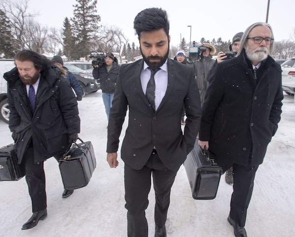 Jaskirat Singh Sidhu, the driver of the truck that struck the bus carrying the Humboldt Broncos hockey team arrives with his lawyers Mark Brayford, left, and Glen Luther, right, for closing arguments at his sentencing hearing Thursday, January 31, 2019 in Melfort, Sask.Ryan Remiorz/The Canadian Press