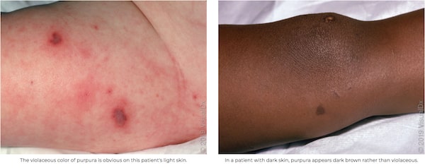 The violaceous color of purpura is obvious on the left patient's light skin. In a patient with dark skin, purpura appears dark brown rather than violaceous, as seen at right.Image appears with permission from VisualDx