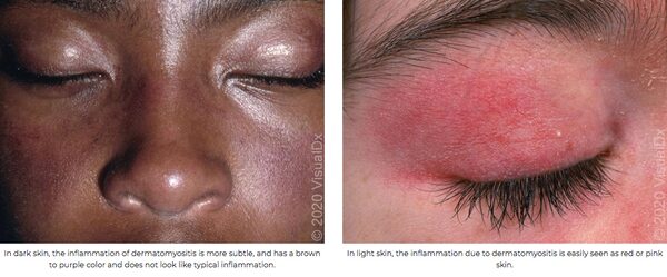 In dark skin, the inflammation of dermatomyositis is more subtle, has a brown to purple colour and does not look like typical inflammation. In light skin, the inflammation due to dermatomyositis is easily seen as red or pink skin.Image appears with permission from VisualDx