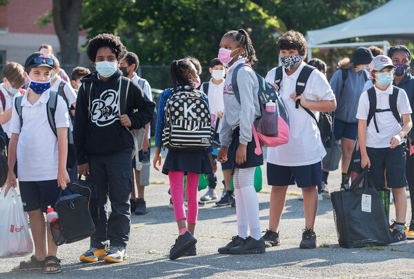 Students line up before attending class on the first day of school in Montreal on Aug. 31.Graham Hughes/The Canadian Press
