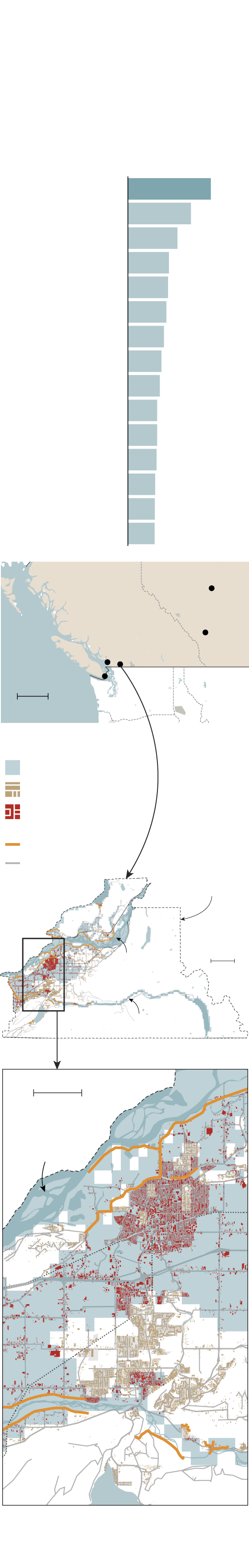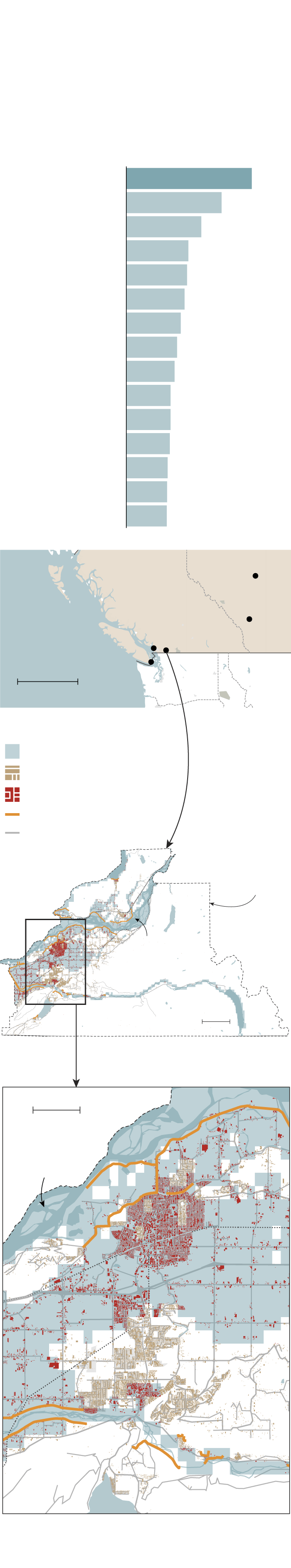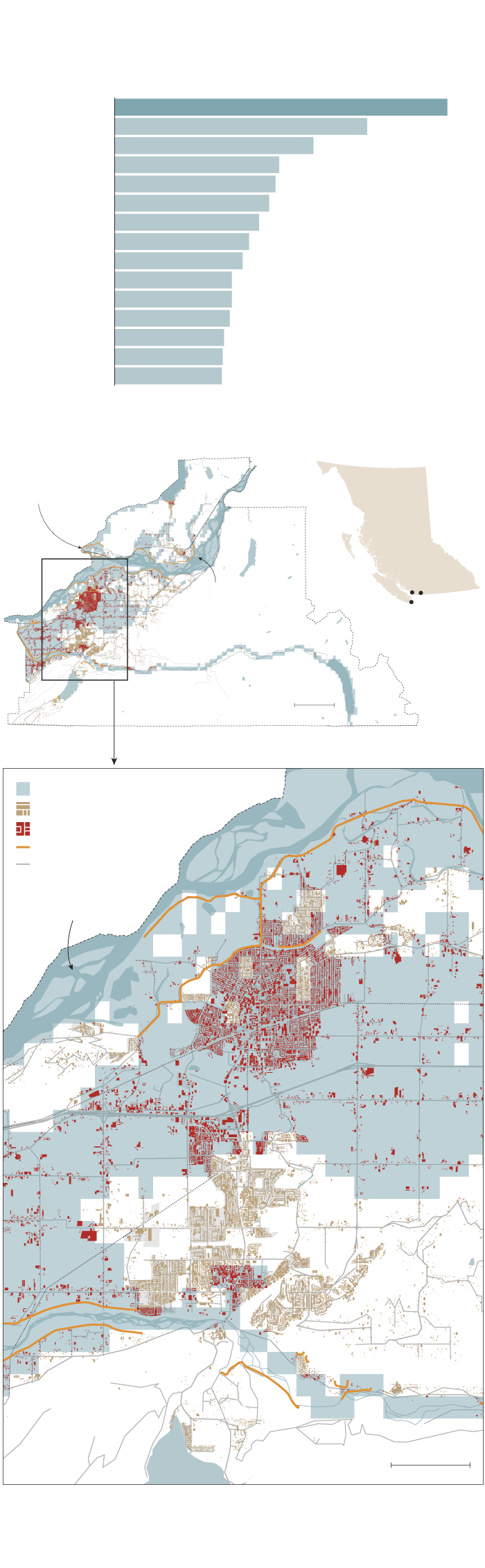at least one-tenth of their buildings within river floodplains. Chilliwack, B.C. had unusually high exposure. The community relies on networks of dikes for protection.