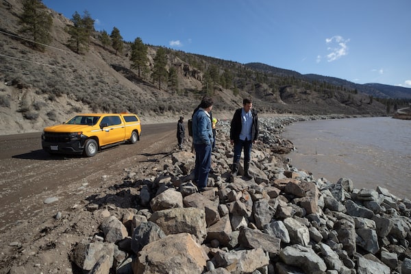 B.C. Minister of Transportation and Infrastructure Rob Fleming, (below, right) examines the work to rebuild a portion of Highway 8 washed away by flooding in November, 2021, west of Merritt, B.C.DARRYL DYCK/The Canadian Press