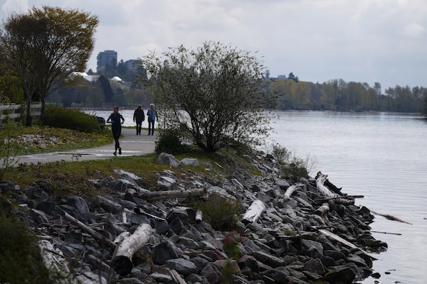 People run and walk along the dike on the north arm of the Fraser River in Vancouver on April 22, 2022.DARRYL DYCK/The Globe and Mail