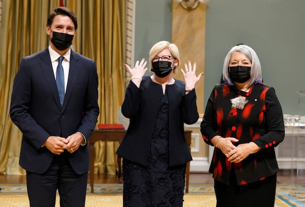 Cabinet minister Carla Qualtrough, shown at October's swearing-in with Prime Minister Justin Trudeau and Governor-General Mary Simon, tabled the legislation to create a Canadian Disability Benefit. She and Mr. Etmanski were co-chairs of the federal COVID-19 disability advisory board.BLAIR GABLE/POOL/AFP via Getty Images