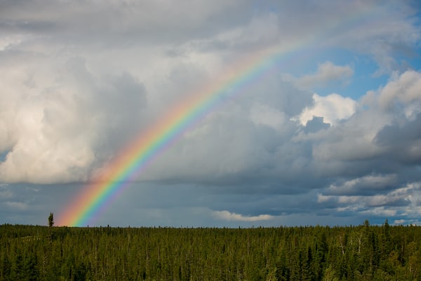 A rainbow is seen over Provincial Road 290 north of Gillam, the road where the fugitives' burned-out car was found.