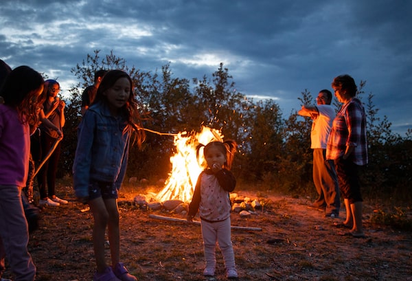 A family holds a beach bonfire at Stephens Lake near Gillam, Man., on the Friday evening after RCMP said they found the remains of fugitives Bryer Schmegelsky and Kam McLeod in the Northern Manitoba bush.Photography by Melissa Tait/The Globe and Mail