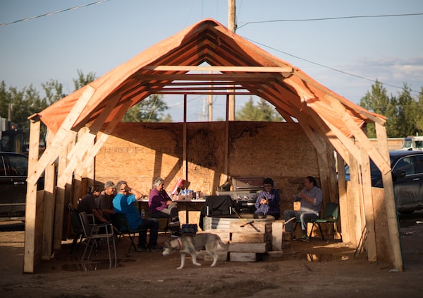 Elders sit at a makeshift community hall. Ms. Neckoway says that when its orange tarp blew down last Thursday, she took it as a sign that the time for healing had begun.