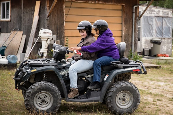 Linda Neckoway, right, sits on an ATV with her granddaughter at home. Some elders in the Fox Lake Cree Nation's Bird reserve have barely left their homes while the manhunt was ongoing.
