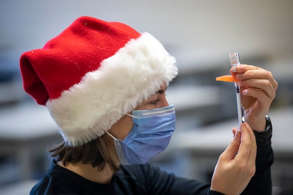 Medical student Morgyn McKerlie draws outs COVID-19 vaccine at a drive-thru COVID-19 vaccine clinic at St. Lawrence College in Kingston, Ont., on Dec. 4.Lars Hagberg/The Canadian Press
