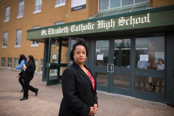 High school math teacher Karen Ebanks poses for a photo outside St. Elizabeth Catholic High School in Thornhill, Ont.Tijana Martin/The Globe and Mail