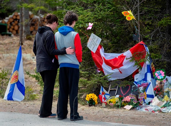 Visitors to a roadside memorial pay their respects in Portapique, N.S., on April 24, 2020.The Canadian Press