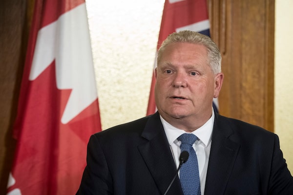 Ontario Premier Doug Ford speaks to the media following a cabinet shuffle at Queen's Park in Toronto on June 20, 2019.Tijana Martin/The Canadian Press