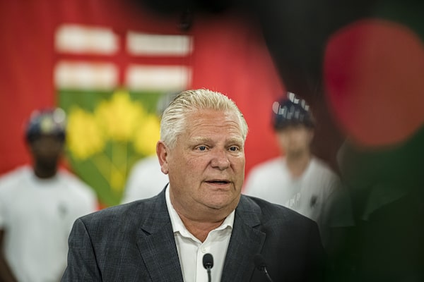 Ontario Premier Doug Ford makes a campaign stop at the Finishing Trades Institute of Ontario, in North York, Ont., on May 17.Christopher Katsarov/The Canadian Press