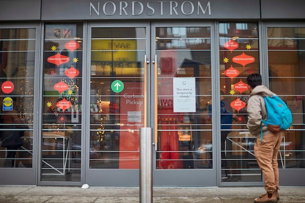 A man stands in front of the Nordstrom store, closed for in-store shopping in downtown Toronto, on Nov. 23, 2020.GEOFF ROBINS/AFP/Getty Images