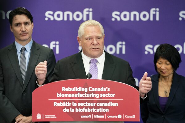 Ontario Premier Doug Ford, centre, delivers remarks while being flanked by Prime Minister Justin Trudeau, left, and Toronto Mayor Olivia Chow, right, during a press conference in the facilities of vaccine producer Sanofi, in Toronto on May 30.Arlyn McAdorey/The Canadian Press