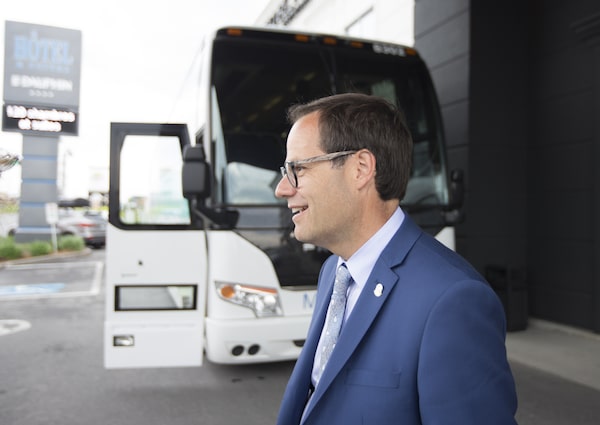 Drummondville Mayor Alexandre Cusson arrives to meet the bus full of immigrants.Christinne Muschi/The Globe and Mail