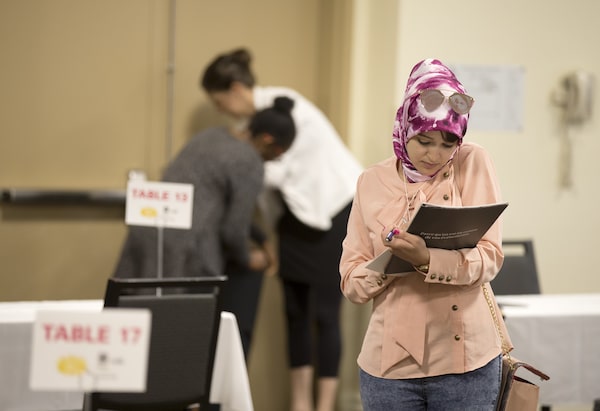 Karima El Ouali from Morocco makes notes after a meeting with potential employers. She says she’ll stay in Drummondville if she finds work there. ‘Otherwise, I’ll go to Montreal.’Christinne Muschi/The Globe and Mail