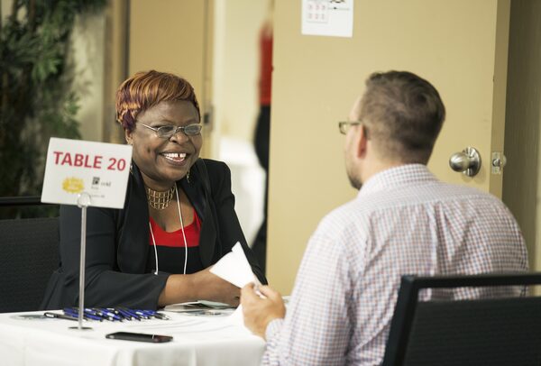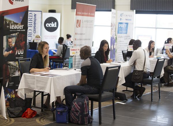 After disembarking from the bus, the travellers sat down in a hotel ballroom for short, prearranged interviews with prospective employers – everything from a hotel to an industrial plant to the Desjardins financial group. Jobs on offer ranged from chambermaids and machinists to customer-service agents and industrial engineers.