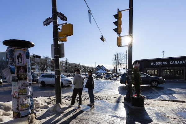 People wait to cross the intersection of Whyte Ave and Gateway Blvd in Edmonton, Alta. on Jan. 15, 2022. A plan to create 15-minute cities, with amenities in walking distance for residents, in new developments in Edmonton has become a subject of controversy and conspiracy theories.Megan Albu/The Globe and Mail