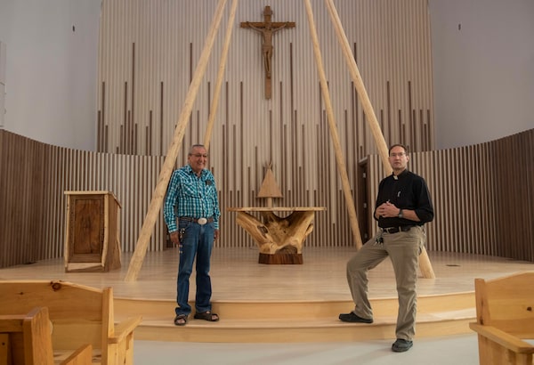 Fernie Marty, left, and Father Mark Blom stand by the the newly-renovated church's altar, which is made from the roots of a tree, in relation to a metaphor for Indigenous people as a tree buffeted by storms.AMBER BRACKEN/The Canadian Press
