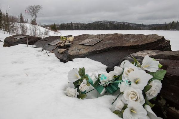 A memorial in Elliot Lake for Lucie Aylwin and Doloris Perizzolo, who lost their lives in the 2012 mall collapse.