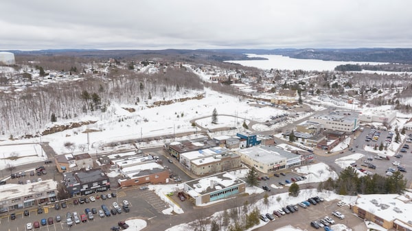 An aerial view of Elliot Lake's city centre with the site of the old Algo Centre Mall an empty lot almost 14 years after the collapse.