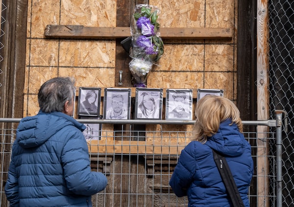 Sylvie and Robert Lacas pay their respects at the site of the fire where their granddaughter Charlie Lacroix was killed three years ago along with six others.Christinne Muschi/The Canadian Press