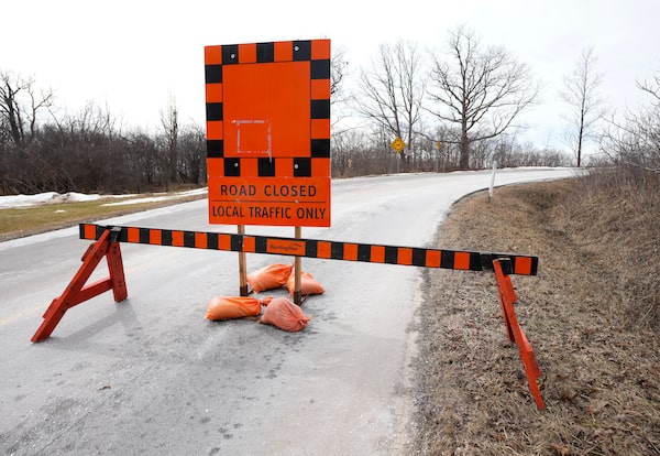 A section of King Road is closed every spring since 2012 to help the Jefferson salamander who live along the Niagara Escarpment as they make the nocturnal trip to their vernal pools in Burlington, Ont., on March 12.Nathan Denette/The Canadian Press