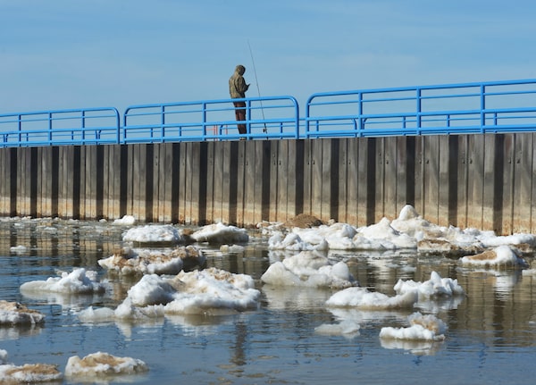 Chunks of ice float in Lake Michigan as a fisherman tries his luck off the South Pier in St. Joseph, Mich., on March 12.Don Campbell/The Associated Press