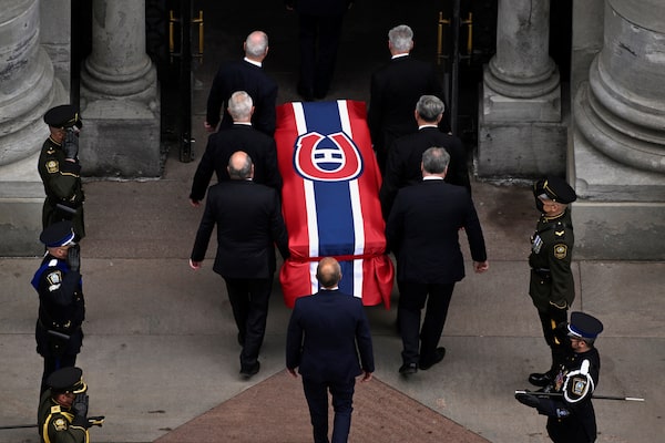 The casket of Guy Lafleur is carried into Mary Queen of the World Cathedral during his national funeral in Montreal on Tuesday.BERNARD BRAULT/Reuters