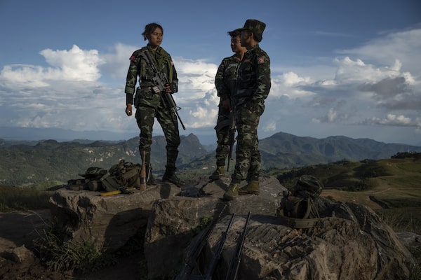 Karenni soldiers stand on top of a rock overlooking a valley on Oct. 9, 2022, eastern Myanmar.Siegfried Modola/The Globe and Mail