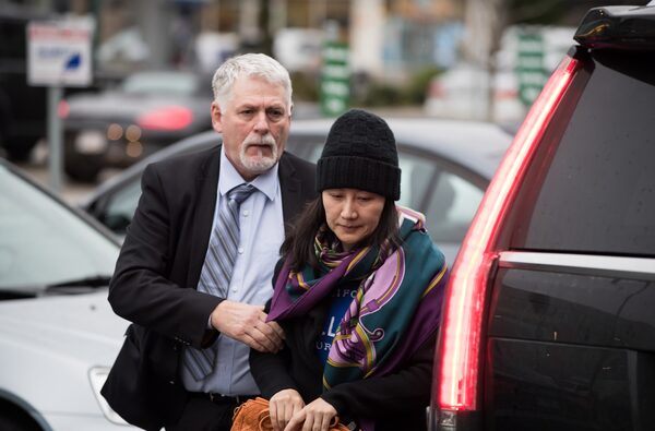 Huawei CFO Meng Wanzhou is escorted by a member of her private security detail while arriving at a parole office in Vancouver on Dec. 12. (Darryl Dyck/The Canadian Press)DARRYL DYCK/The Canadian Press