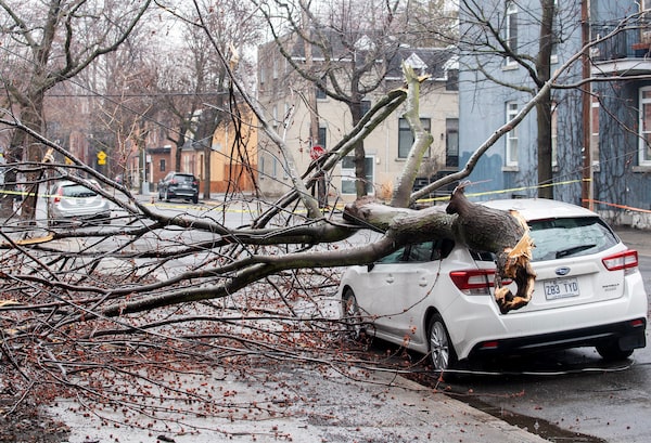 A tree that fell on a car is shown following an ice storm in Montreal, April 6, 2023.Graham Hughes