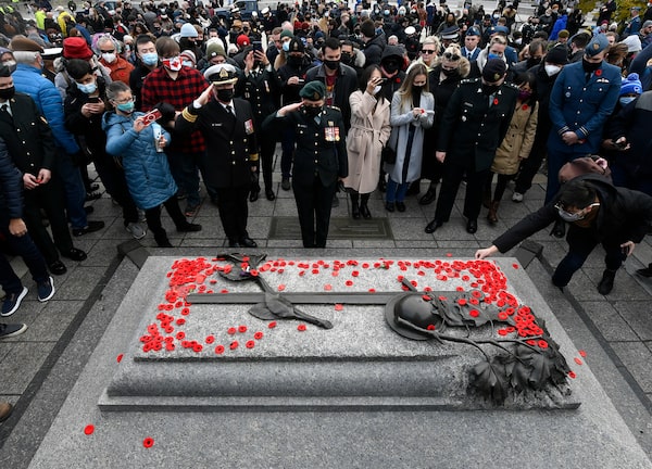 Canadian Forces members salute after placing their poppies on the Tomb of the Unknown Soldier at the National War Memorial following the National Remembrance Day ceremony in Ottawa.Justin Tang/The Canadian Press