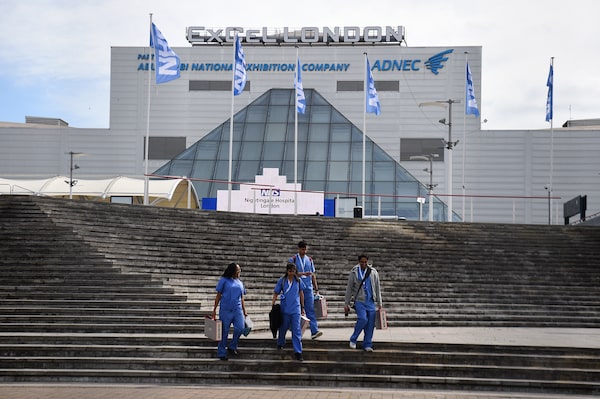 NHS workers leave the NHS Nightingale Hospital at the ExCel centre in London, with Hunter Wellington Boots that they have been gifted. The hospital is to stop admitting new patients following limited demand for its services.Kirsty O'Connor/PA