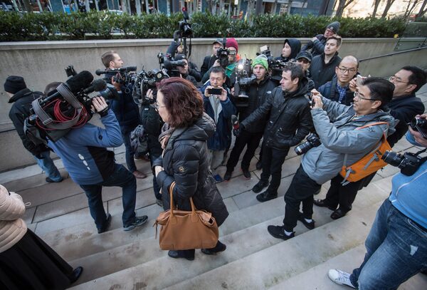 Members of the media crowd around an unidentified woman who was attending a bail hearing for Meng Wanzhou, the chief financial officer of Huawei Technologies, during a break in proceedings at B.C. Supreme Court in Vancouver, on Friday December 7, 2018.DARRYL DYCK/The Canadian Press
