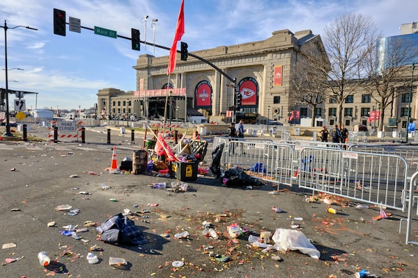Debris left by fans near the scene where shots were earlier fired near the Kansas City Super Bowl victory parade in Kansas City, Mo., Feb. 14, 2024.DOMINICK WILLIAMS/The New York Times News Service