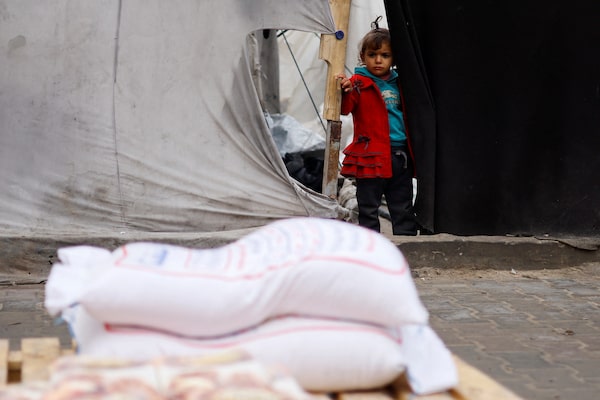 A Palestinian girl looks at bags of flour distributed by the United Nations Relief and Works Agency (UNRWA), amid the ongoing conflict between Israel and Hamas, in Rafah in the southern Gaza Strip January 29, 2024.IBRAHEEM ABU MUSTAFA/Reuters