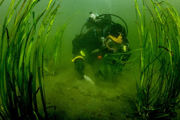 Commercial diver Jamie Smith of the SeaChange Society uses a spade to plant eelgrass into an area that historically had lush seagrass beds, but were wiped out due to human activity.SHANE GROSS/The Globe and Mail