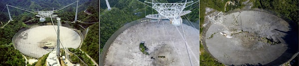 This combination of pictures of the Arecibo Observatory shows, left to right, a handout photo taken on Nov. 29, 2006, a file photo taken on Nov. 19, 2020 and an image on Nov. 19, 2020.RICARDO ARDUENGO/AFP/Getty Images