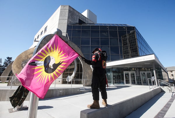 A family supporter of murdered women stands outside the Manitoba Law Courts during the trial of serial killer Jeremy Skibicki in Winnipeg on May 8.JOHN WOODS/The Canadian Press