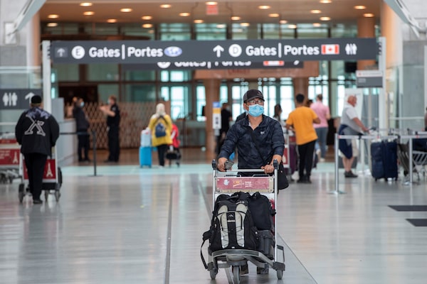 A passenger wearing a mask at Toronto Pearson International Airport on June 23, 2020.CARLOS OSORIO/Reuters