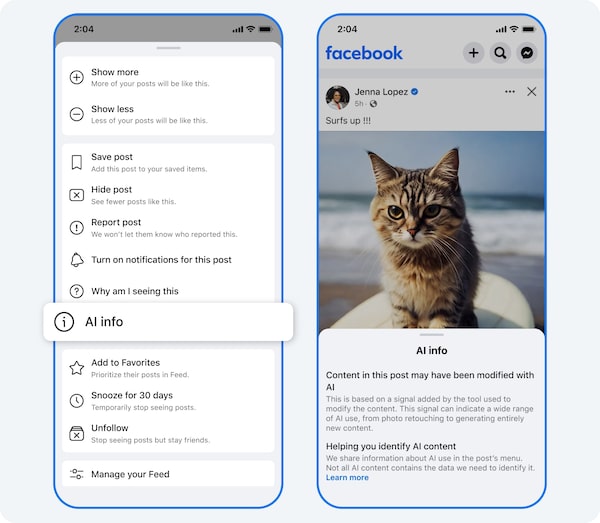 Image from a Meta blog post showing how an "AI info" label may be applied to synthetic content.Meta