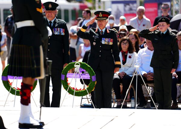 Chief of the Defence Staff Jennie Carignan, centre, salutes after placing a wreath during a ceremony to mark the 80th anniversary of the Victory of the Pacific and the end of the Second World War at the National War Memorial in Ottawa on Friday.Sean Kilpatrick/The Canadian Press