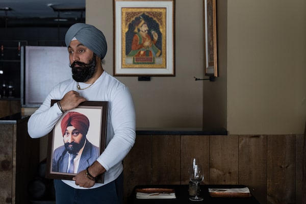 Simar Singh Anand holds a photo of his father Gurinder (Babu) Singh Anand in his restaurant in Montreal, on March 4.Christinne Muschi/The Canadian Press