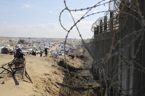Palestinians displaced by Israel's air and ground offensive on the Gaza Strip sit next to the border fence with Egypt, in Rafah, on Jan. 24.Hatem Ali/The Associated Press